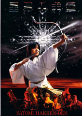 今村:タイトルのイメージの絵は「西口司郎さん」っていうイラストレーター(『ブラックジャック』の単行本等のイラスト)が、決まってたんだけど、どんなイメージなのかっていうのを聞かれて、まず役者の入んないポスターを作ったんですよ。その時、僕が「お話の中でね、赤い海、あー海があって赤い雲があります。こういう風になって8つの玉が光芒のように散る」というようなお話をしたりしてさ。イメージ出しをした。それがトップのタイトルに使ってもらえたってことは、良かった。『里見八犬伝』は、何でその仕事がきたんか?っていうと、やっぱり、僕にとってみると、この写真を角川映画としてやったってことが角川映画での一つの評価だよね。