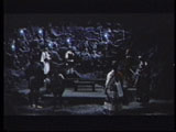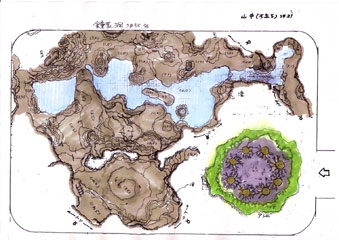 今村:まず「館山城の大広間」がキーになるんで、どういう基調にするかなぁ?って、それこそ10ぐらいのバリエーション考えたから。もっと木造の普通って言っちゃ可笑しいけれども、木のガンっとした重い感じの様なの?っていうのもあるかなぁとか。でも地下に潜っていくんだから、やっぱり石がいいかなぁ?と。石だったらどうしようとかね。で、仏壇のような柱が欲しいなあと思ったら、あの黒い柱のようなものになってくるんだけれどもね。物量的な問題にしても。これが残念だけど、ハリウッドでルーカスなりがなんなりやれば、そのくらいのが4つも5つも出来るんだよなあ。奥にガーンっていったら、向こうには中広間があるのか、何があるのかわからんけどさ。あと「血の池」のセットと、もうひとつ「海道」っていって船が入ってくるセットとで、まあ大体この城の関係のものになるんだけどさ。