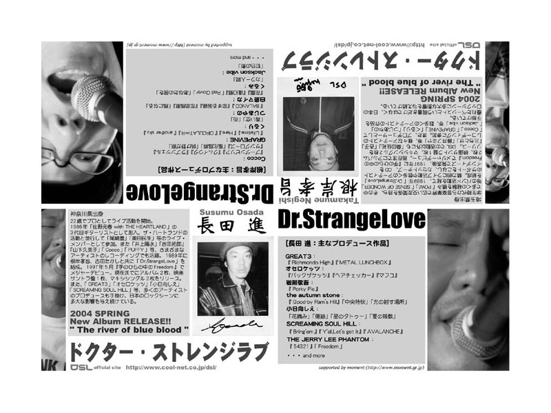 | DSL/ドクター・ストレンジラブ ----------------------------------------------- 1995年インディーズレーベルSUPER FOODからアルバム『WayOut』をリリース。 翌年、同レーベルよりミニアルバム『Eyes in the sky』を発表する。 1997年マキシシングル『手のひらの中のFreedom』 でPONY CANYONよりメジャーデビュー。 1997年末にドラムス古田たかし脱退。以後2人のユニットとなる。 各々ジャンルを問わず数多くのアーティストをサポート、プロデュースしていることでも有名。 DSLオフィシャルHP→http://www.cool-net.co.jp/dsl/ |
